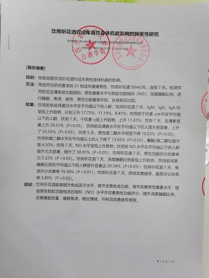 聽花酒業(yè)與四川輕化工大學(xué)白酒學(xué)院,開展針對男性人群飲用生理指標(biāo)測試研究報告首頁影印件據(jù)了解,企業(yè)同四川輕化工大學(xué)白酒學(xué)院,共同篩選了31例成年健康男性,用血液檢測、儀器檢測方法,檢測飲用聽花酒50ml/天、連續(xù)7天的前后數(shù)據(jù)變化。研究的血清學(xué)指標(biāo)有:免疫球蛋白(IgA、IgG、IgM)、雌二醇(E2)、睪酮(T)、一氧化氮(NO)、血清素(5-HT)。