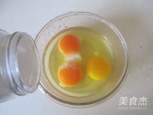 雞蛋打入碗中, 加入適量的鹽和1勺料酒打散;