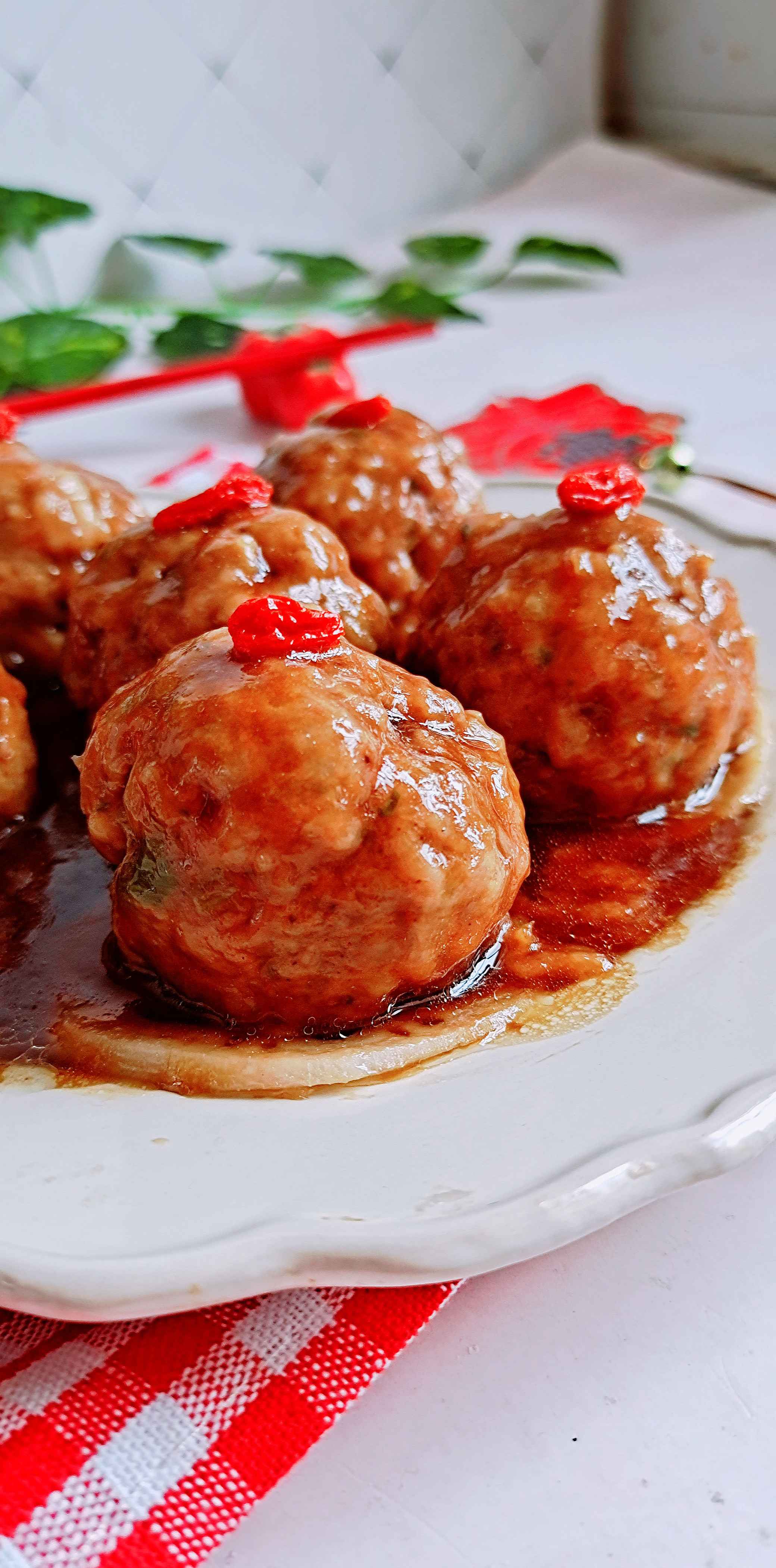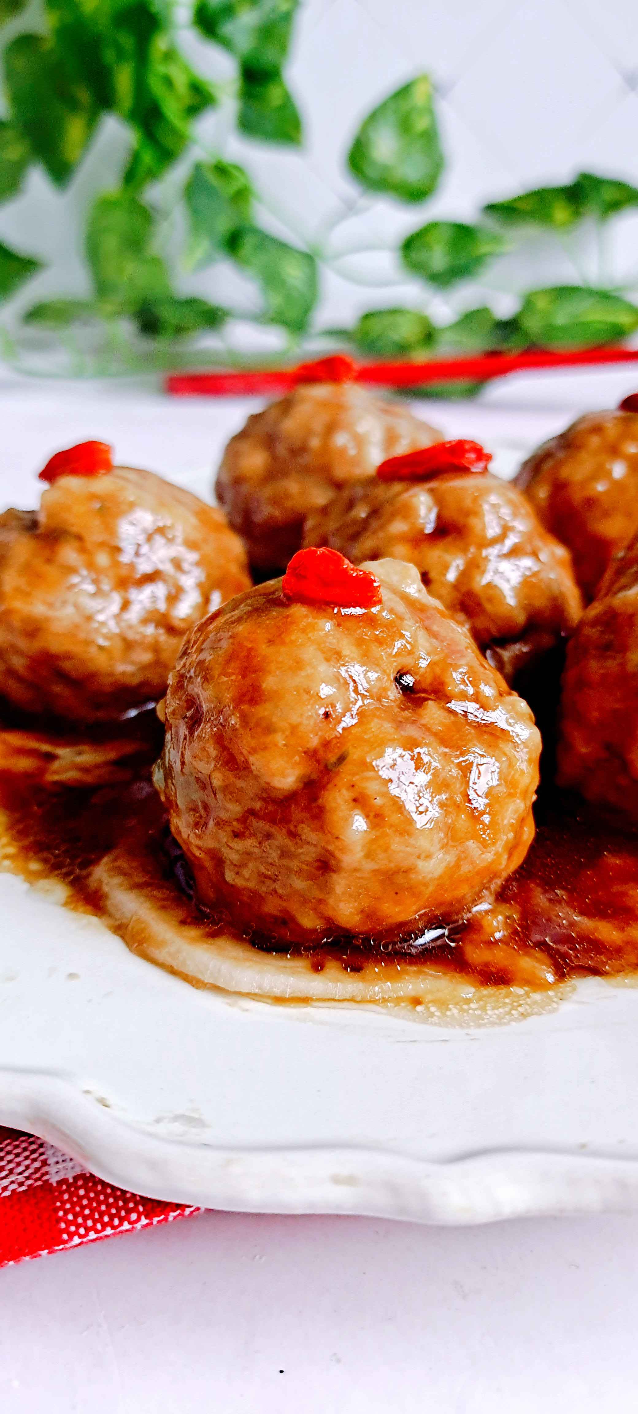 12.糖醋汁澆在肉圓上,枸杞裝飾。