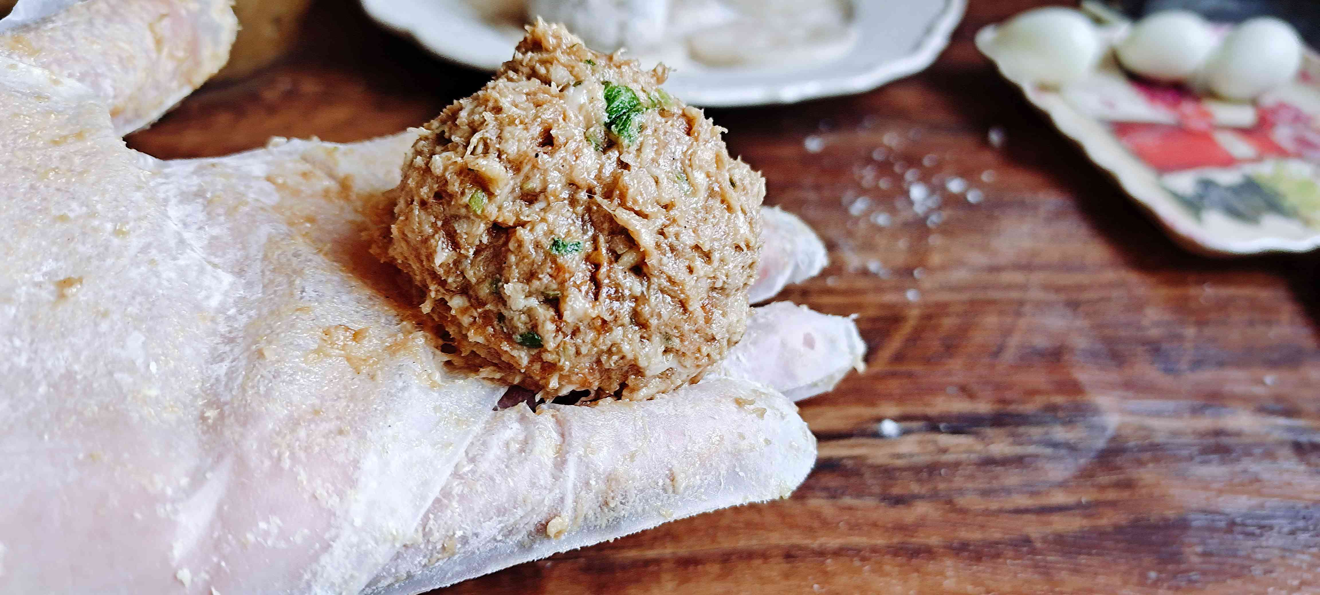 4.取適量肉餡放入一個(gè)熟鵪鶉蛋。