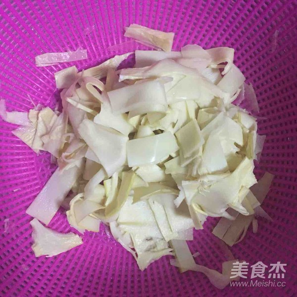 鍋內(nèi)不放油,倒入筍片干炒三分鐘,烘干筍片里的水分,這樣炒的時候更入味。