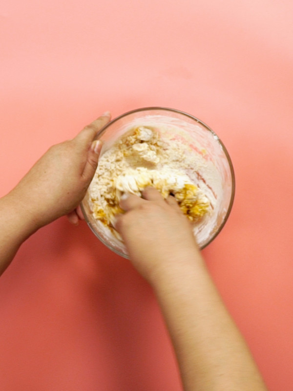 2.加入酵母粉,白砂糖,面粉,攪拌成絮狀,揉成面團