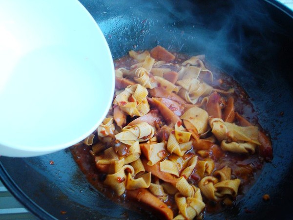 加入千張結,因為豆瓣醬和火腿都有鹽味,不用加鹽,加生抽快速翻炒均勻,中火燒3分鐘左右