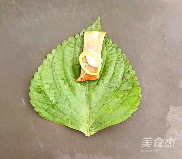 17.取一片紫蘇葉,在上面放一塊烤肉