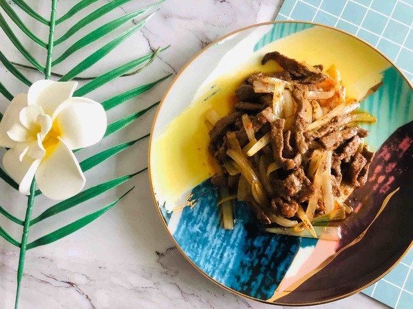 洋蔥炒軟倒入牛肉絲翻炒即可