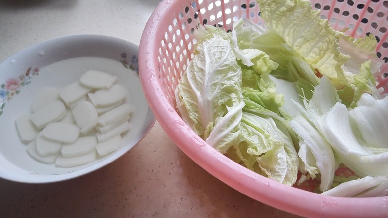 白菜洗凈,用手掰小即可,年糕切片浸泡在水中